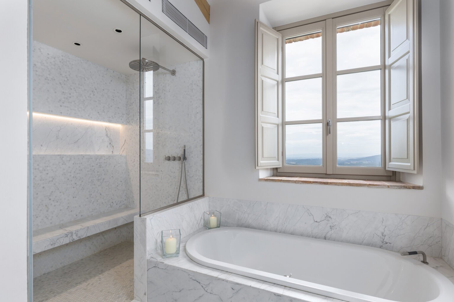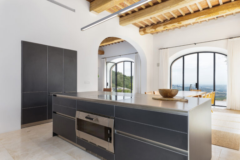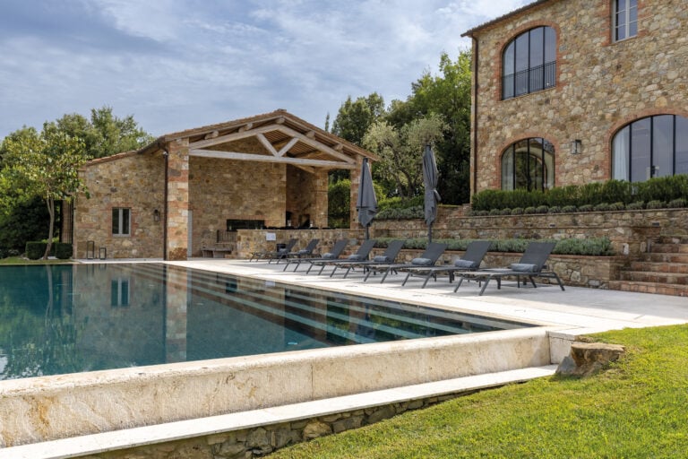 Casale Le Macie features state-of-the-art modern finishes in comfortable spaces. The floor-to-ceiling windows offer expansive views of the Tuscan hillsides while 5 bedroom suites and a media room offer privacy to relax and unwind.