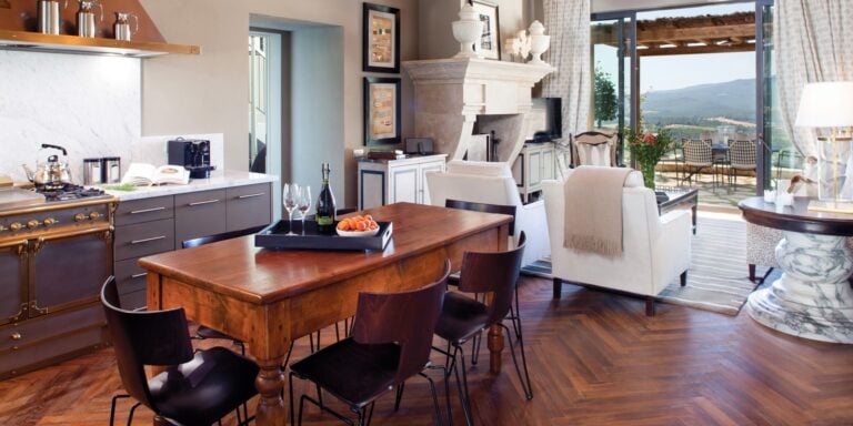 Dating back to the 18th century, these beautifully restored residences overlook one of the estate’s most scenic vineyards and offer a truly peaceful setting. Each villa features sweeping views and is appointed with fine Italian furnishings, traditional kitchens, modern bathrooms, and a private terrace. A heated, glass-tiled infinity pool is shared among just six villas. Conveniently located near the estate’s restaurants, fitness center, and other amenities, these villas offer both comfort and accessibility in the heart of Casali di Casole.
