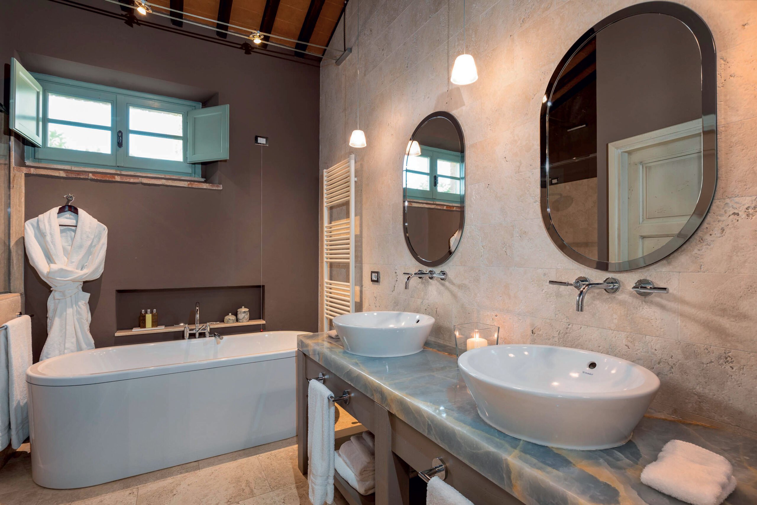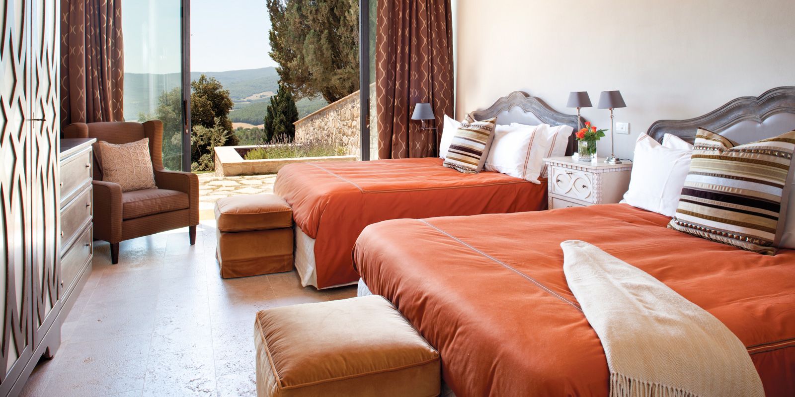 For an unforgettable Italian getaway with family and friends, Casali di Casole offers two luxury villa options. The two-bedroom villas feature one king and two queen beds, two bathrooms, and a private garden with an outdoor hot tub. The three-bedroom villas boast breathtaking views and include three master suites with ensuite baths, an outdoor wood-burning oven, and access to a shared infinity pool. Both villa types are ideally situated just steps from the estate’s top amenities, including dining, fitness, and entertainment.