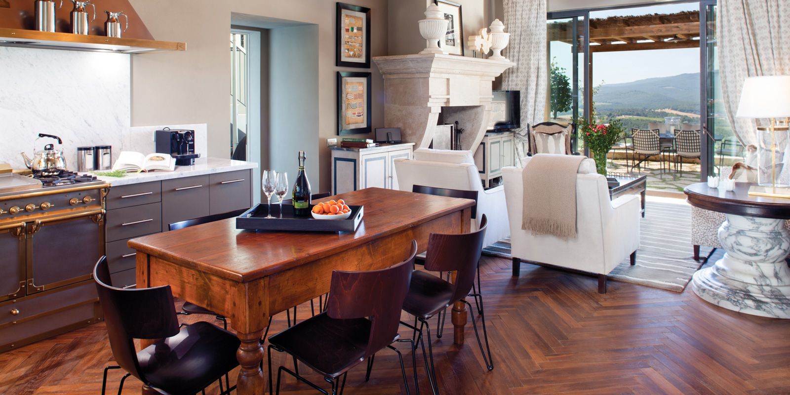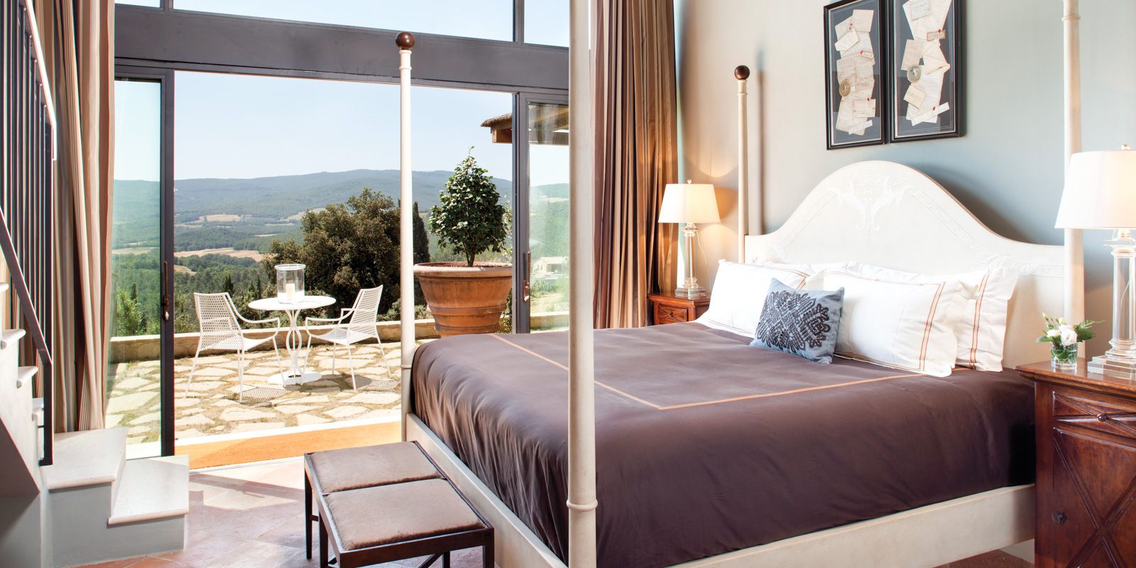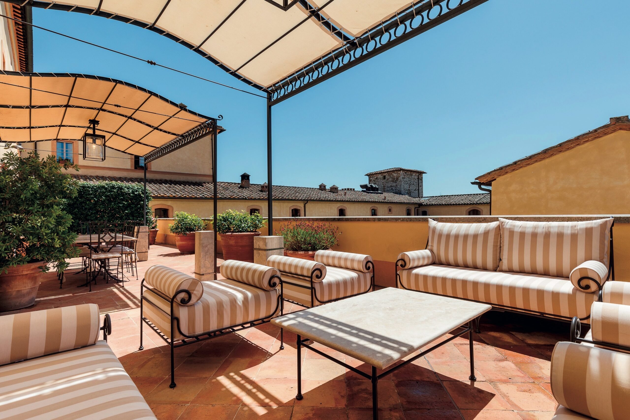 Located within the main building of the magnificent Belmond Castello di Casole, the two-level, 3,350-square-foot Bargagli Penthouse includes three primary suites with attached ensuites, a full gourmet kitchen, elegantly appointed living and dining areas, and a large private terrace — perfect for alfresco dining while taking in panoramic views of the stunning gardens and surrounding landscapes.